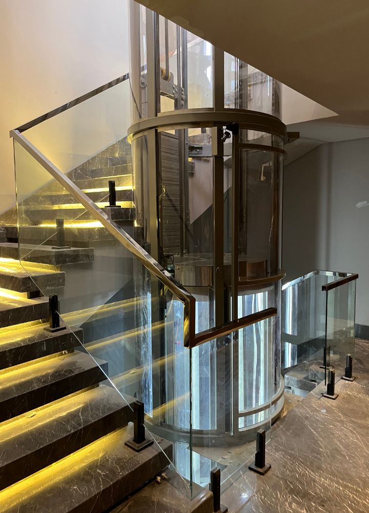 The Mini Home Lift is a machine-room-less (MRL) home elevator, meaning all drive and control components are integrated within the lift itself, eliminating the need for a separate machine room. This allows for a more compact installation, reduced construction work, and maximum space efficiency.